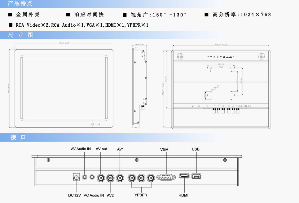 輸入信號:RCA Video×2,RCA Audio×1,VGA×1,HDMI×1,YPBPR×1