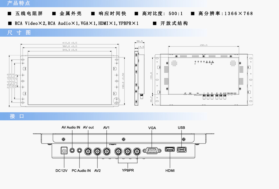 | 輸入信號(hào) | RCA Video×2,RCA Audio×1,VGA×1,HDMI×1,YPBPR×1 | ||