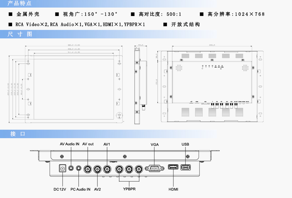 輸入信號:RCA Video×2,RCA Audio×1,VGA×1,HDMI×1,YPBPR×1