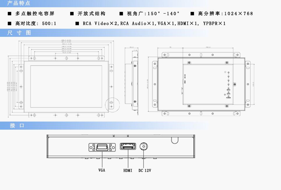 | 輸入接口 | RCA Video×2,RCA Audio×1,VGA×1,DVI×1,HDMI×1 | ||